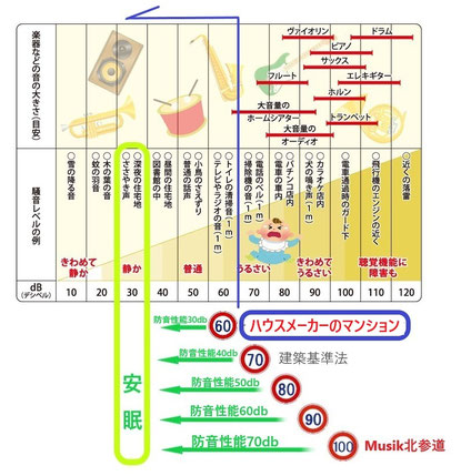 ちなみにこの防音性能は、建築基準法の要求値以下ですが、建築基準法違反にはなりません。