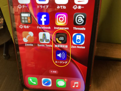 App Storeから2つのアプリ(無料)をダウンロードします。ひとつは《エージング》:音響測定用のザーッという騒音。もうひとつは《騒音測定器》です。