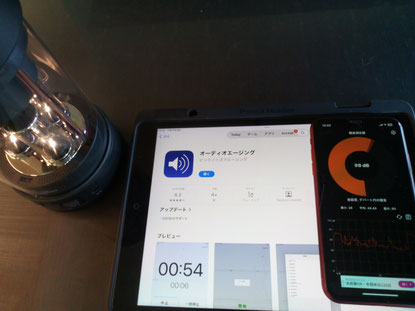 右の画像では、iPadに《エージング》をダウンロードして、スピーカーで鳴らしています。それをスマホにダウンロードした《騒音測定器》で測っているところです。