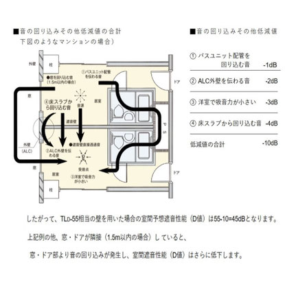 工場での実験で40dBの性能が出る材料を使えば合格になりますが、現実の建物では壁以外から音が回り込み、結果的に30dBに下がります。