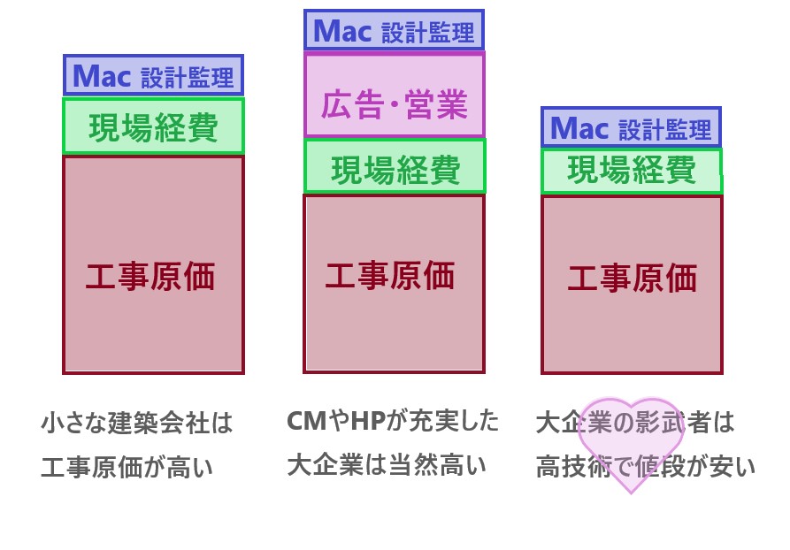 工事原価は安くても、広告宣伝費、営業マンの人件費、取締役の報酬といった経費が非常に大きいため、最終的な金額は高くなります。
