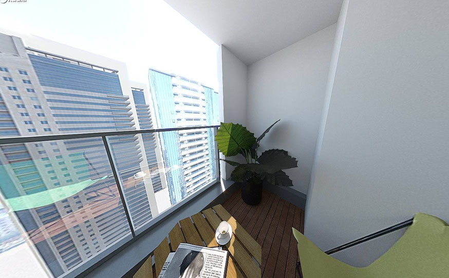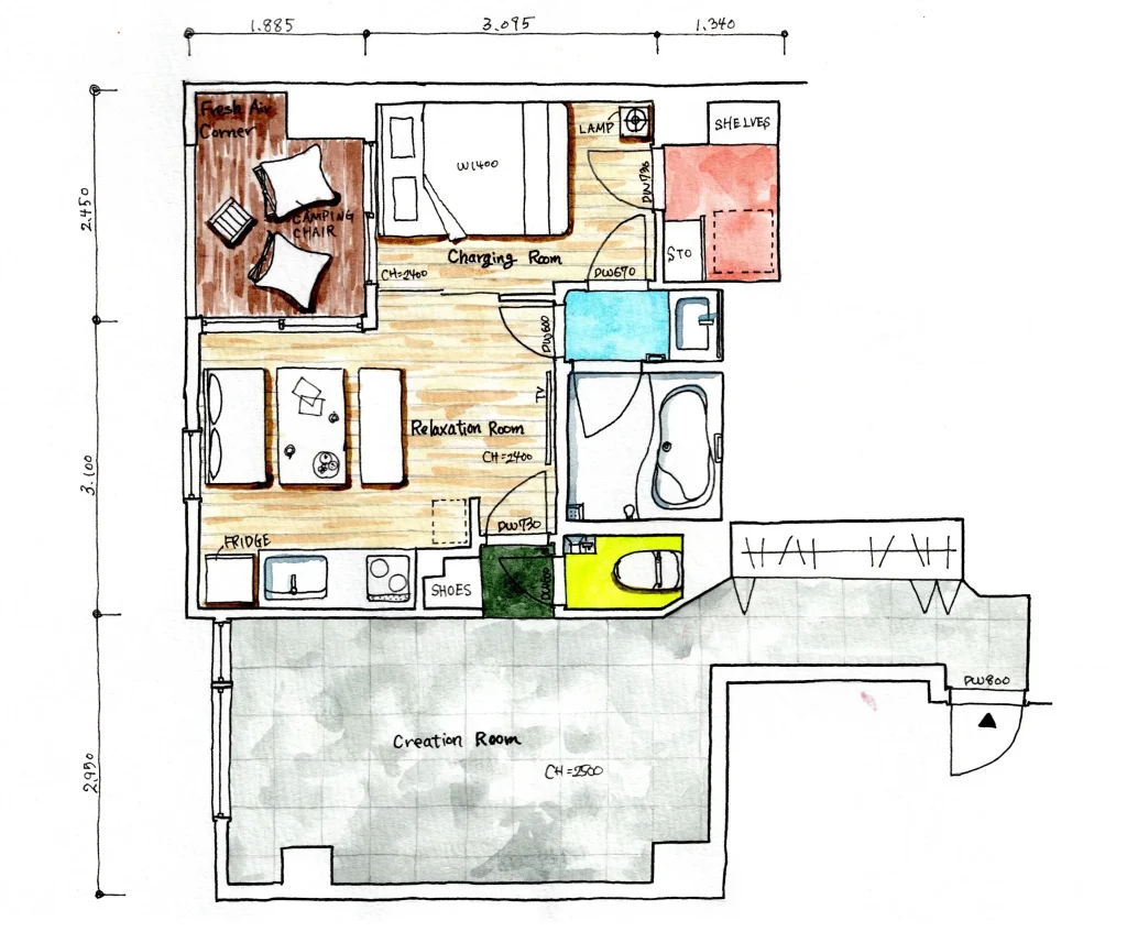広いワンルームでも、同じ場所に24時間いれば気分が停滞します。心のゆとりに欠かせない「気分転換できる場所の存在」を加えました。