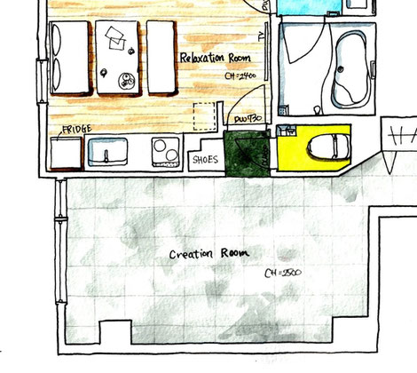 さらに、Relaxation Roomへの入り口は生活感のあるものが視界に入らない位置に配置。扉を開けたときの視線や空間の印象にもこだわりました。
