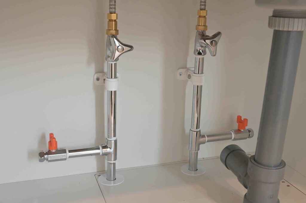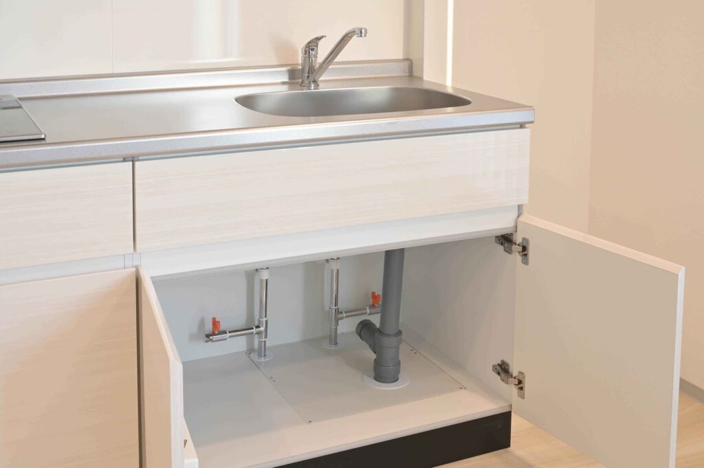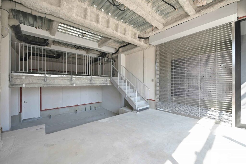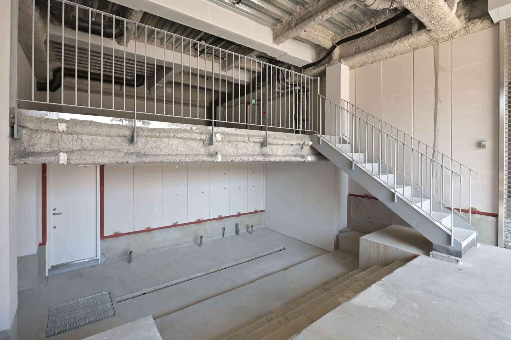 テナント2:カフェの厨房部のアップ。ひらし端にある白いドアは従業員と、食材を搬送してきた人の入り口。 お客と業者の動線を交錯させない。