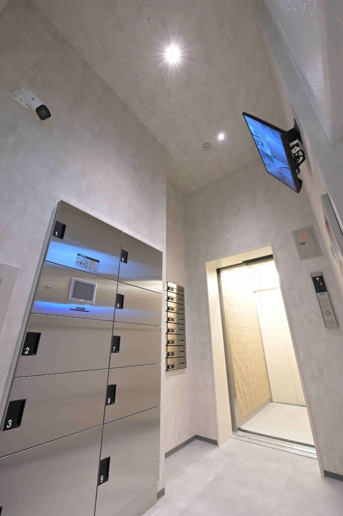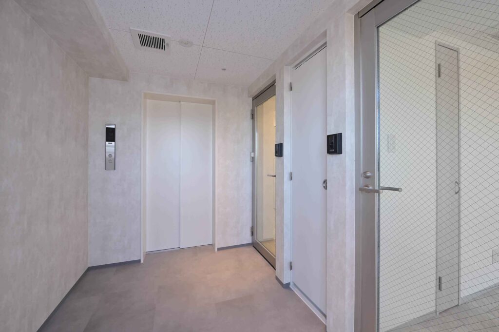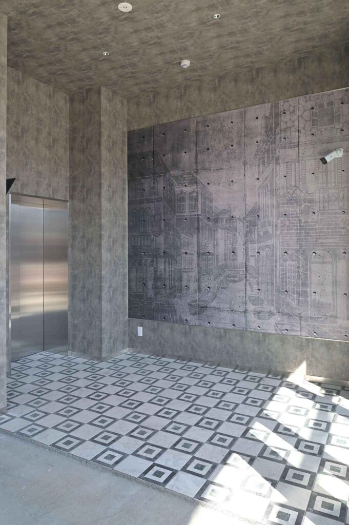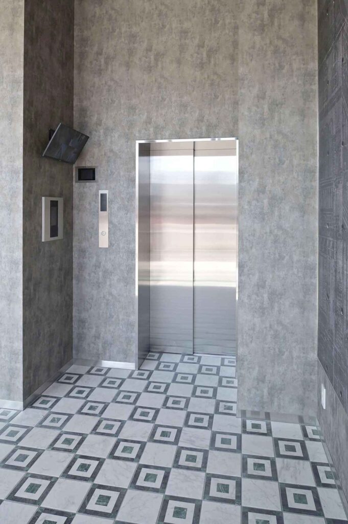 EV乗場:ハードで切れ味がある仕上げ。マンションっぽくない。エアタグをもっていると勝手にEVが降りてきて開く。