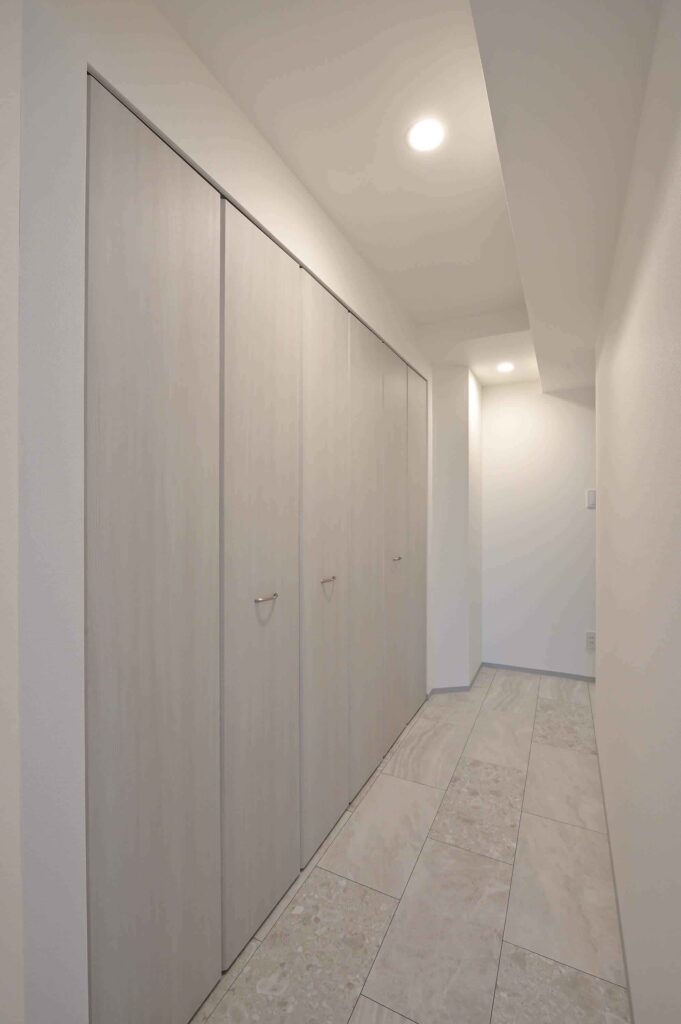 A仕事と生活を分けるワイドクローゼット。開けると照明が点灯します。長い廊下が、不安と期待を高める演出にも。