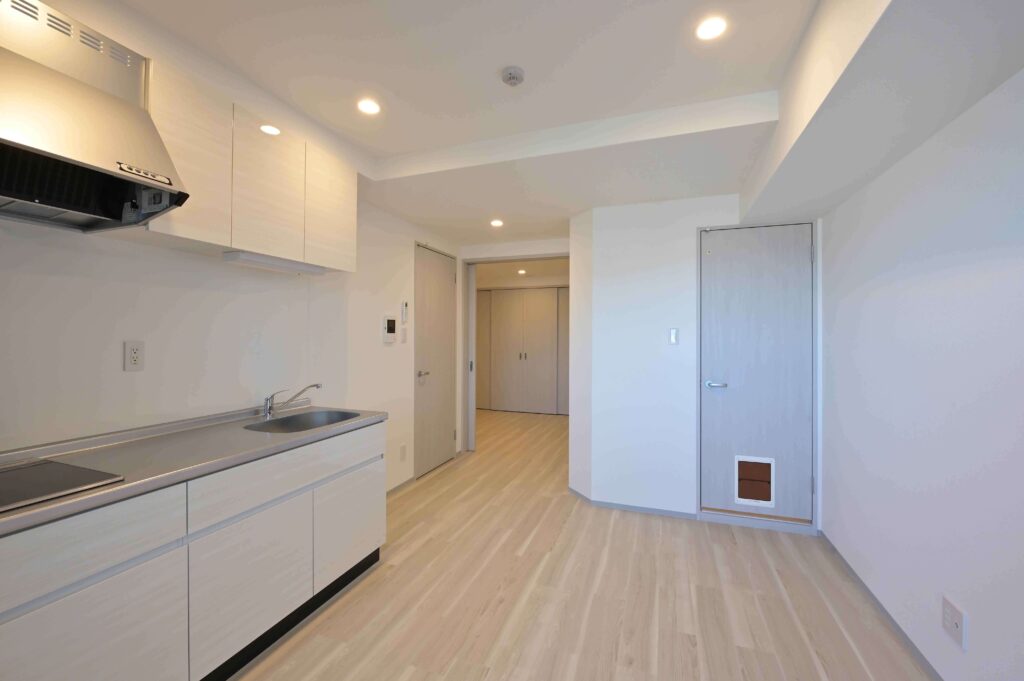 B LDK:エステでオイルマッサージも施してジェットバスに入る場合、生活臭を最小限にするため、キッチンもホワイト系保護色にした。猫ドアがあるのが、洗面の入り口。