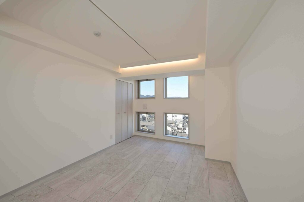 A ジョブ 長い廊下の先に、光が広がる大きな窓。天井レールで自由な照明演出を可能にし、エアコンはビルトインで生活感を抑えた。