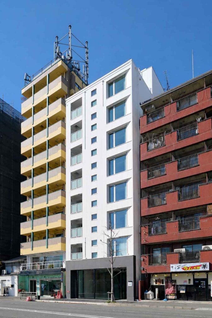 中央が新築のTreeTree京都。左は若き日に設計した1Rマンション。両隣より約1.5倍の高さを持つ1階部分が、この建物の象徴。
