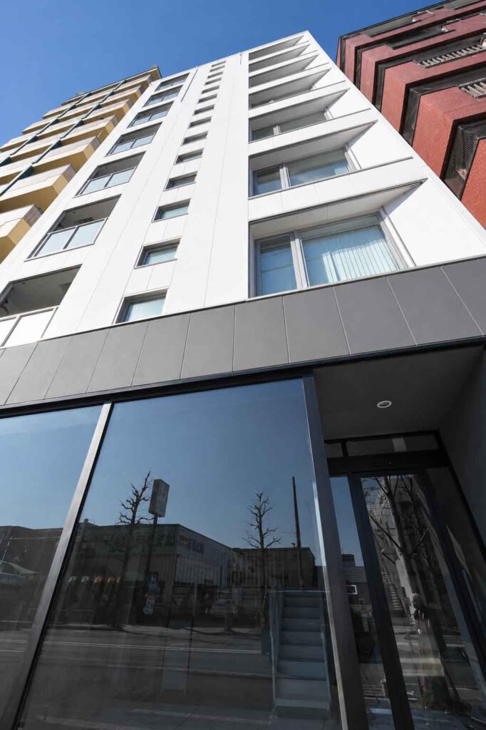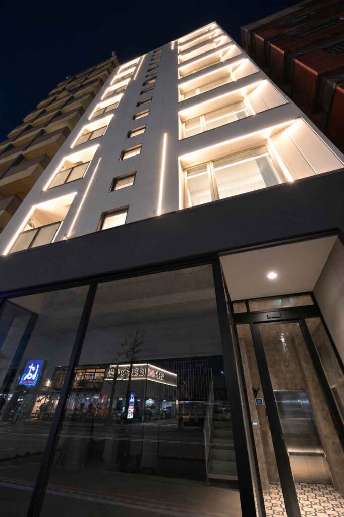 夜景見上げ:洗練された都会的な佇まい。どこか東京を感じさせる、シャープでスマートな外観です。
