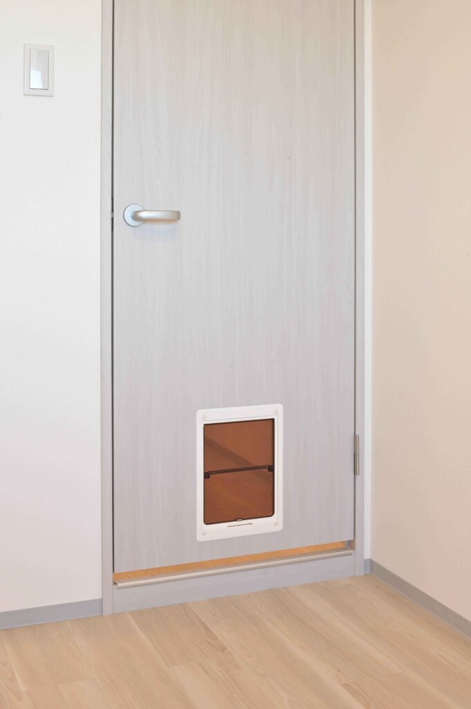 猫扉。この奥は洗面室です。洗面室の隅に猫のトイレを置いてください。洗面所の換気扇をつけておけば匂いも完璧。